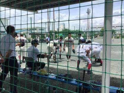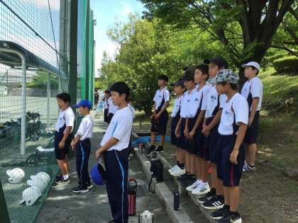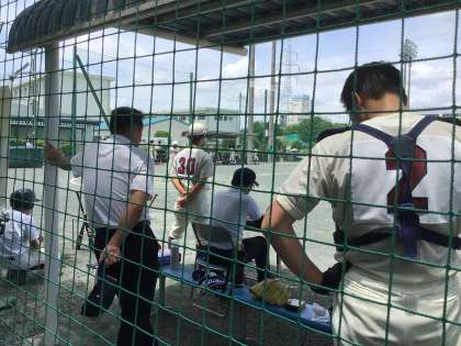 写真は末野原グラウンドで行われている野球の大会です。本校は2、3年生の部員が少ないため、昨年度に引き続いて他校との合同チームで出場しています。今年度は豊南中学校と合同チームです。1年生もしっかり声を出して応援していました。