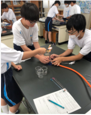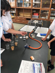 1年生の理科では、6月下旬から化学分野の学習に入りました。身の回りにある物質の性質を調べることから学習が始まり、3種類の白い粉末(砂糖・食塩・片栗粉)の性質を調べて区別する実験を行いました。白い粉末をガスバーナーで加熱したり、自分たちで考えたオリジナルの実験を行ったりしてどんな特徴があるかを調べていました。