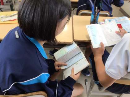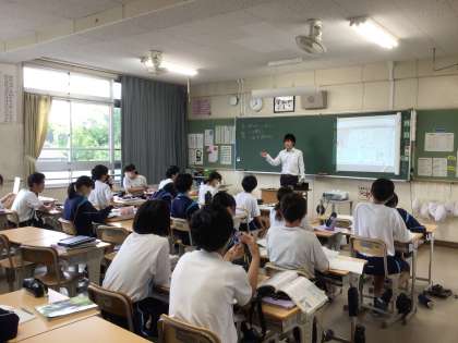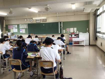 4時間目の様子です。写真の上から2年1組の理科、2年2組の社会、2年6組の英語です。2年6組英語では、隣同士で単語の問題を出し合っていました。