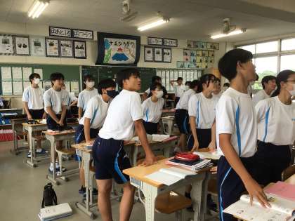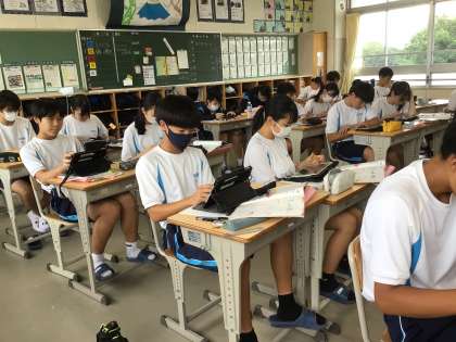 3年7組の英語の様子です。上の写真は市教委が導入してくれた個別最適な学習ができるソフト「キュビナ」に取り組んでいる様子です。生徒の学習状況(回答状況)をAIが分析して、個々に合わせて出題してくれます。