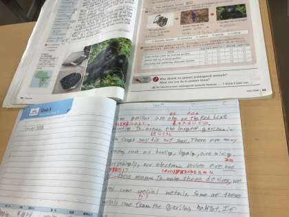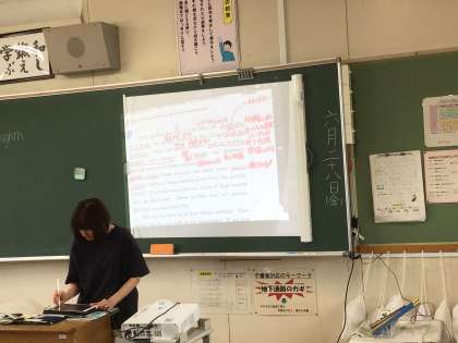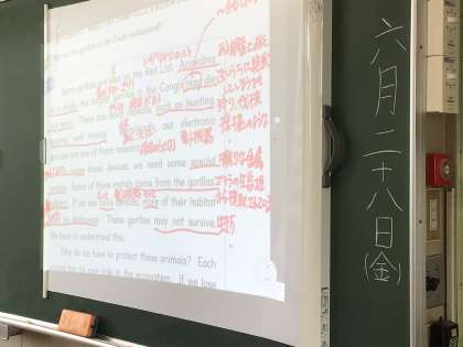 3年6組の英語の授業です。先生がICT機器を使って電子黒板にどんどん和訳を書き込んでいきます。それをノートに写していく生徒たち。内容はゴリラたちの生息地であった自然環境がレアメタルの掘削によってどんどん破壊されているというものでした。さすが3年生。授業にしっかり取り組んでいます。