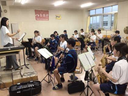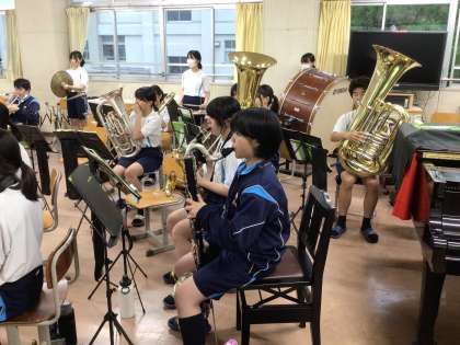 吹奏楽部は7月6日(土)に行われる豊田市中学校吹奏楽演奏会と、7月7日(日)に行われる中部日本吹奏楽コンクール地区大会を控えています。みんなで音と気持ちを寄せ合って良い演奏をしてくださいね。写真は音楽室で合奏をしている2、3年生の様子です。