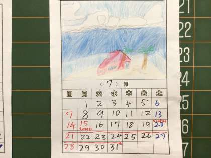 ⚫︎1、2、3学級の子たちが毎月各学級や職員室、校長室に届けてくれるカレンダー。6月はトトロが傘をさしている絵でしたが、7月は青空と白い雲、椰子の木に赤い家が描かれています(描かれている絵はそれぞれ違います。)毎月楽しみです。ありがとう。