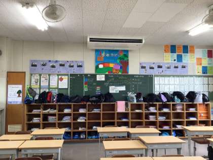 ⚫︎ロッカーの上にプールバッグがずらりと並んだ教室。写真は1年生教室です。暑い日はプールが気持ちいいですね。本校のプールも建てられてから40年が経過し、ご多分に漏れずにお年を召してきました。濾過する機械などに随分サビが目立ちます。全国的にも昭和の終わり頃に建てられたプールが多いようです。無理もないですね。体育の先生たちが一生懸命に水の管理をしてくれています。