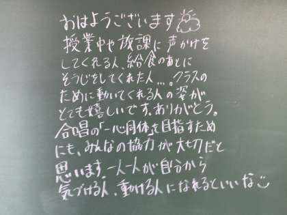 ⚫︎1年生教室の黒板日記。生徒を一番そばで見ている担任の先生だからこその黒板日記です。担任の先生と生徒たちにとって教室は大切な場所です。