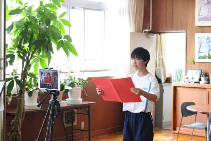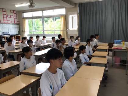 2時間目の全校集会の様子です。代表生徒の話は今回は1年生です。校長、生徒指導担当、交通安全担当からも話をしました。各学級と校長室をタブレットでつないで集会を行いました。みんなしっかり聞いています。