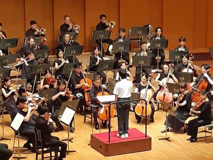 心に残るコンサートの「指揮者体験」の様子です。指揮によって演奏が大きく変わることが聴いている生徒たちにもよく伝わってきたことと思います。本校からも代表の生徒がステージに上がり、指揮に挑戦しました。曲はブラームス作曲「ハンガリー舞曲第5番」です。テンポや強弱が変化する曲で指揮はかなり難しそうです。指揮棒を貸していただいて指揮台に上がった時は相当緊張したのではないでしょうか。指揮者の中井さんからは「上手ですね」とお褒めの言葉をいただきました!素晴らしい体験ができましたね。