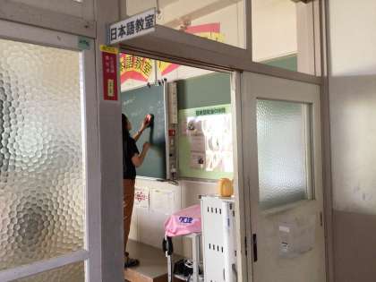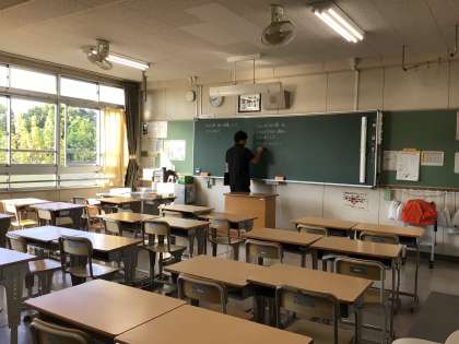 廊下の向こうから響いてくる朝の音。生徒が登校する前の教室で先生たちが黒板に向かっています。とても大切な朝のひと時を邪魔しないように廊下からタブレットで写真を撮る、その微かな音にも先生が振り返ります。さすが、集中しながらも背中にも目や耳がついているかのようです。