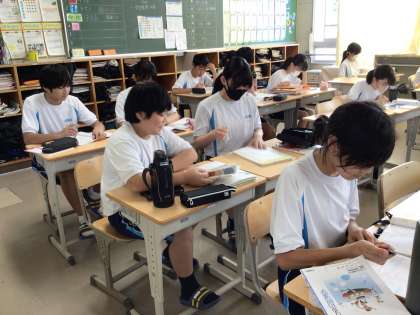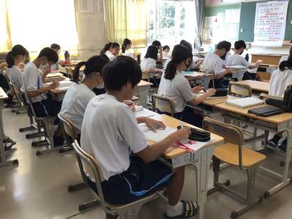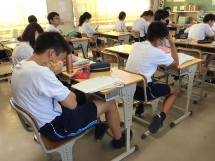 写真は登校直後の生徒たちの様子です。教室に入ってカバンをロッカーに入れ、席に着くとすぐにノートや教科書を開いて直前の確認をしていました。3年生はもちろんのこと、2年生教室でも、1年生教室でもこうした姿が見られましたが、学年が上がるにつれて生徒の意識が上がっていることを感じます。2年生も3年生と同じようにピリッとした雰囲気でテストの朝の時間を過ごしていました。とても成長を感じます。