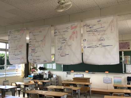 この写真も今朝校内を回った時に見つけてタブレットで撮ったものです。3年生教室の真ん中に大きな紙が垂れ下がっていました。向こう側に回って見てみると、このクラスが歌う合唱曲の歌詞が書かれていて、そこに強弱記号や言葉の発音、歌詞について話し合ったこと、生徒たちが感じたことなどが細かく書き加えてありました。一つ一つ読みました。