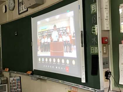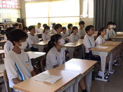 選挙演説を真剣に聞く1年生の様子です。1年生にとっては、中学校での初めての生徒会選挙です。タブレットでスクリーンに映し出される候補者や、諸注意を伝える選挙管理委員が礼をするのに合わせて教室の1年生たちも画面に向かって礼をする姿が微笑ましかったです。