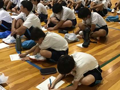 先日の3年生に続いて今日の6時間目は1年生が音楽フェスティバルの学年リハーサルを体育館で行っています。体育館は大変暑いですが、水筒を持参して水分補給をしながら行っています。合唱台への移動の仕方、指揮と伴奏が礼をするタイミング、並び位置の調整も行っています。学年の先生たちや生徒たちは、各学級の歌を聴いて感想を書いています。今後の練習の参考になりますね。