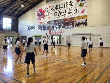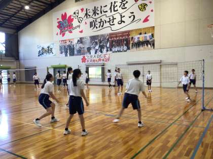 2時間目の体育館です。3年7組と8組がバレーボールのゲームをしていました。独特のルールで行っているようで球技が苦手な生徒もみんな参加できるように工夫されているみたいです。みんな楽しそうで笑顔で盛り上がっていました。