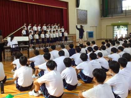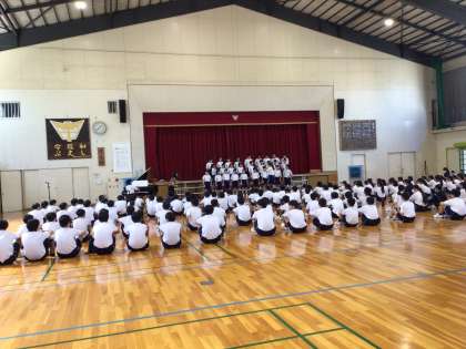 5時間目、体育館で2年生が音楽フェスティバルの学年リハーサルを行いました。2年生は、昨年度、全クラス同じ曲で学年行事として合唱コンクールを行いました。その経験が生きていると感じます。