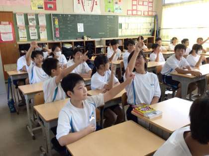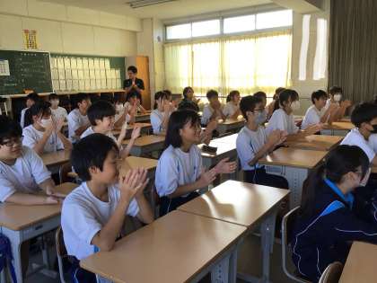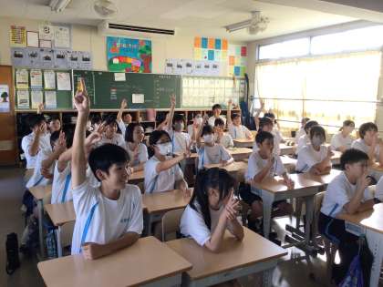 生徒会企画の様子です。3年生が1、2年生教室に行き、タブレットで作成したクイズを出題します。先輩が教室にきてくれることは滅多にないです。とても嬉しそうな1年生の様子です。