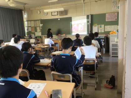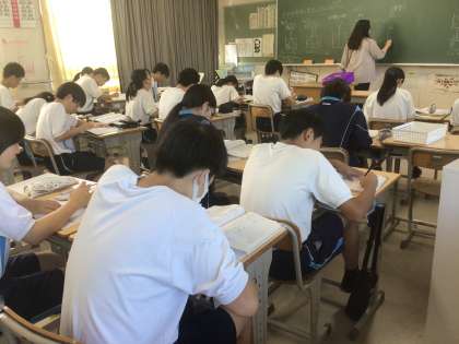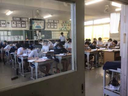 写真は上から3年8組の数学、3年7組の理科、3年4組の英語の授業風景です。さすが3年生。どのクラスの生徒も授業に集中しており、学年フロア全体の雰囲気が落ち着いています。成長が感じられます。