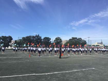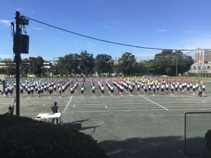 写真は1、2時間目の2年生練習の様子です。2年生は学年全体で息を合わせてフラッグを使った演技に取り組みます。