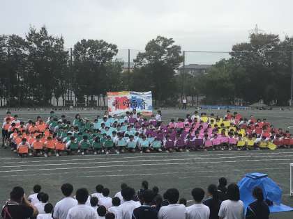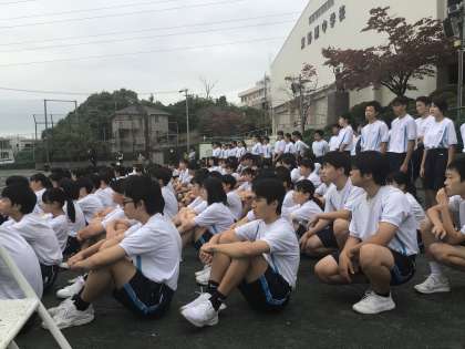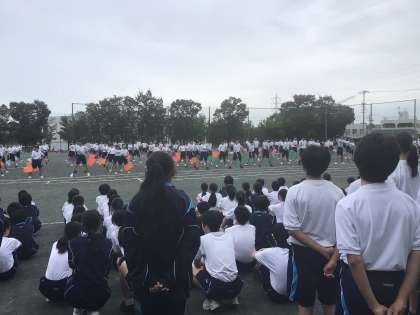雨の心配がありましたので、予行練習をなるべく早い時間に終えるように活動内容や時間割を調整して行いました。写真は2年生の学年演技の様子です。1、3年生の生徒たちは当日は正面から演技を見ることができませんので、今日は正面から演技を見ました。