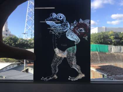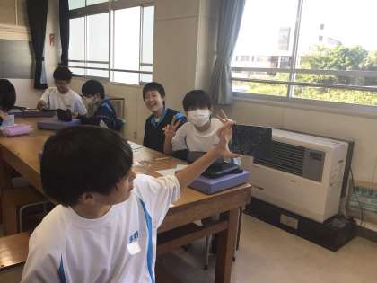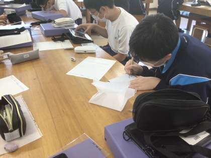 6時間目の美術室の様子です。3年7組が作品づくりをしていました。下絵を描いた紙をガラス板に貼ったものを、先の尖った道具で少しずつ削っていきます。明かりにかざすととても綺麗です。一番上の写真は先生がお手本に作ったものです。先生の作品を借りて窓にかざしてみました。とても素敵です。(ホームページだと画像が鮮明ではなく残念ですが、本物の作品はとても繊細な線で描かれています)生徒たちも「すごい」「きれい」と言っていました。