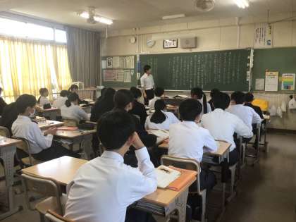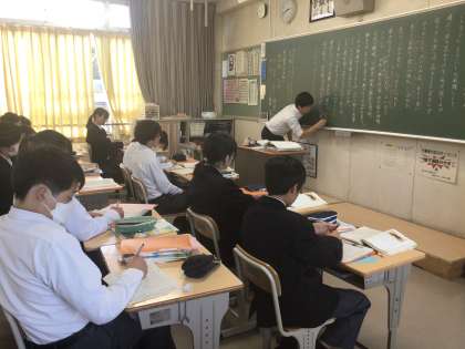 上の2枚の写真は2年4組の国語です。内容は古文。平家物語です。那須与一が扇を射る有名な場面について文法の確認をしながら読み取りをしていました。