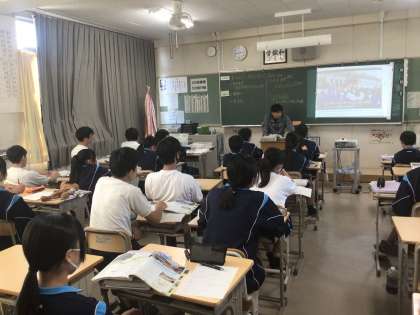 下の写真は2年5組の社会です。2011年の東日本大震災で被害に遭いながらも多くの人の尽力で復興した三陸鉄道に関する動画や教科書を見ながら学んでいました。