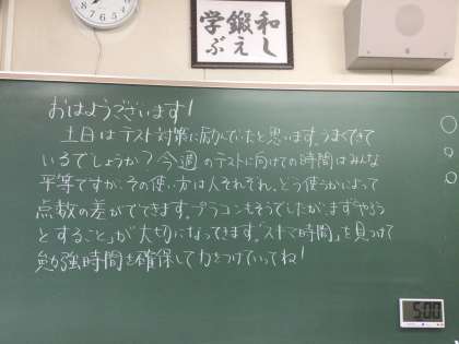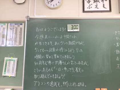 さて、今週の木曜日と金曜日は後期中間テストです。1、2年生は5教科ですが、3年生は進路の関係で来週の月曜日までの日程で9教科のテストを受けます。この週末はしっかり机に向かうことができたでしょうか。ペース配分を上手にして体調を崩さないようにベストを尽くしてほしいです。