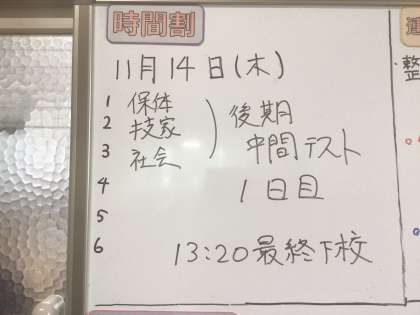 まもなく3時間目が終わります。テスト1日目の各学年の教科は、1、2年生が社会・国語・英語、3年生が体育・技術家庭科・社会です。生徒たちは真剣に取り組んでいました。時間いっぱい見直しをしましょう。名前の書き忘れ、問題の読み間違いなど大丈夫ですか?