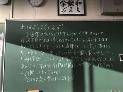 愛知県が行っている「県民ウィーク」の一環として、昨年度から県民ウィーク期間中に1日、学校ホリデーが設けられています。三連休はゆっくりできたでしょうか。良いお天気で、お出かけ日和でしたね。今朝は読み聞かせがあります。