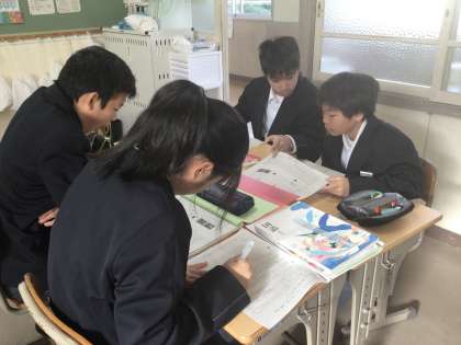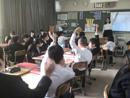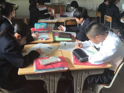 1年2組の国語の授業の様子です。シジュウカラは「ジャージャー」という鳴き声を発することがあり、その鳴き声の目的が何であるかを実験と検証で明らかにしていく、という内容の文章です。より説得力をもたせるためにどのように論を組み立てたら効果的かということについて、生徒たちは教科書の説明文を分析しながら自分たちの気づきと学びに繋げていました。
