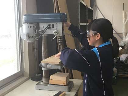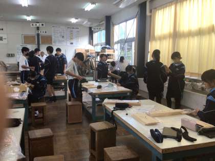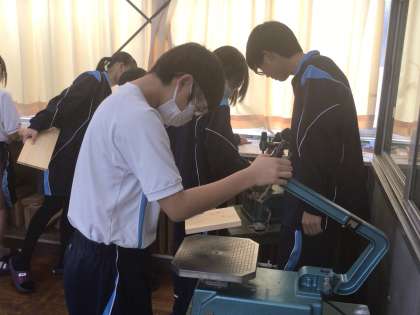 1年1組の技術の授業です。本立てを作っています。糸のこぎりを使う時には安全メガネをはめます。