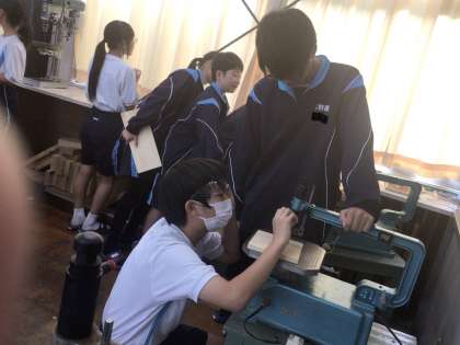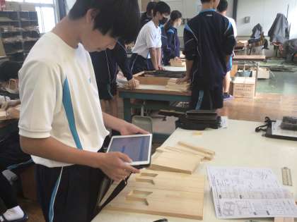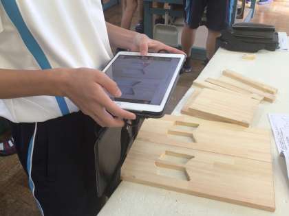 糸のこぎりで板を切り取った状態のものをタブレットで撮影している生徒を発見。写真に撮ったものをスカイメニューの発表ノートを使って先生に提出するそうです。