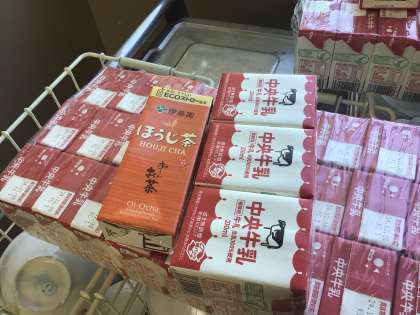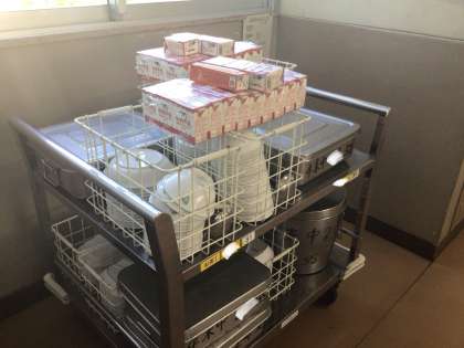 各学級の教室そばまで配膳員さんがワゴンを運んでくれます。牛乳アレルギーの生徒には牛乳の代替としてお茶が用意されます。