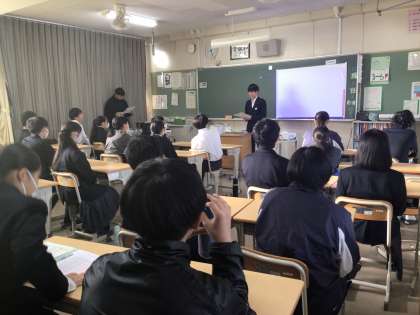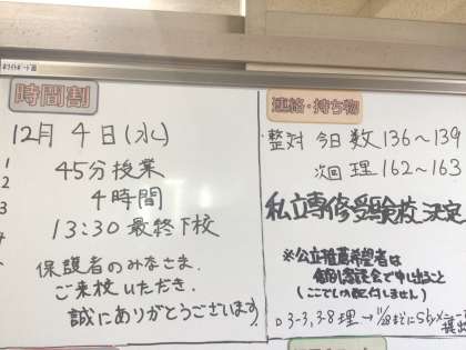 3年生の朝の会の様子です。個別懇談のこと、今日の日課のこと、進路に関わることなどを担任の先生が話していました。3年生の皆さんはいよいよ受験シーズン突入です。冬休みを迎える前にたくさんやることがあります。風邪をひかないように気をつけて毎日を過ごしましょう。