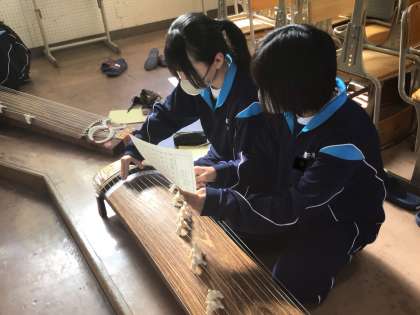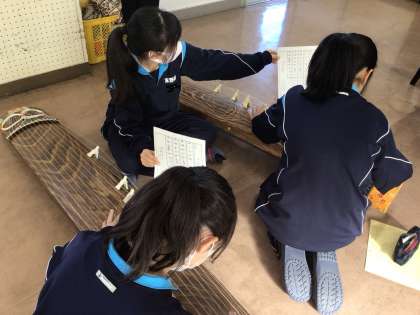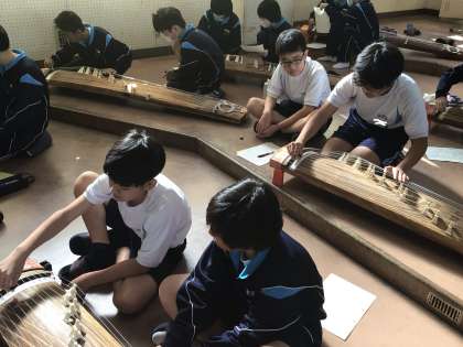 写真は1年2組です。2人で1面(1台)の箏を使います。生徒たちは助け合いながら頑張って演奏していました。