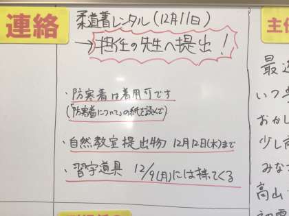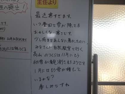 体育祭から1か月ちょっとしか経っていませんが寒くなりました。2年生が年明けに行く乗鞍では11月に初雪が観測されたとホワイトボードに書かれていました。2年生は1月21日(火)から2泊3日で自然教室に出かけます。昨年度の自然教室は大雪で連日マイナス15度でした。その分、雪がフカフカでゲレンデコンディションは最高でした。さて、今年度はどんなお天気になるでしょうか。