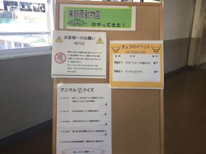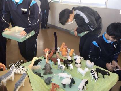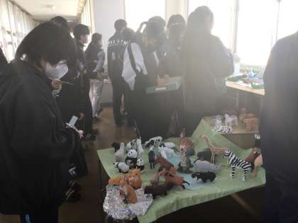 2階渡り廊下に展示してある作品を生徒たちが鑑賞しています。