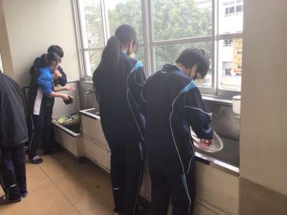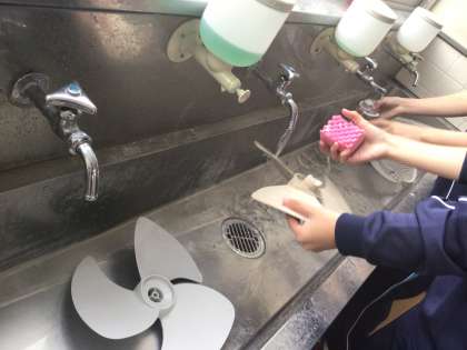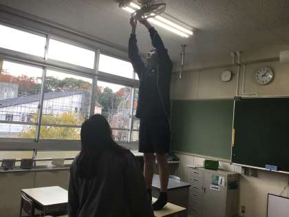 天井から外した扇風機の羽根とカバーを水道でゴシゴシ。乾いて綺麗になった羽根とカバーを天井に取り付けます。先生が見守る中、取り付け作業をしてくれている生徒を発見。背が高いので天井まで手が届きます。作業ありがとう。気をつけて。