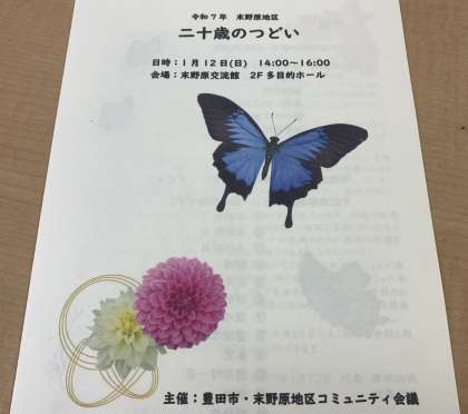 本日午後、末野原交流館にて二十歳の集いが開催されました。末中を卒業して5年。成人になった皆さんが振袖やスーツに身を包んで会場に集まり、懐かしい友達や先生たちとの再会に笑顔があふれ、会話が弾んでいました。
