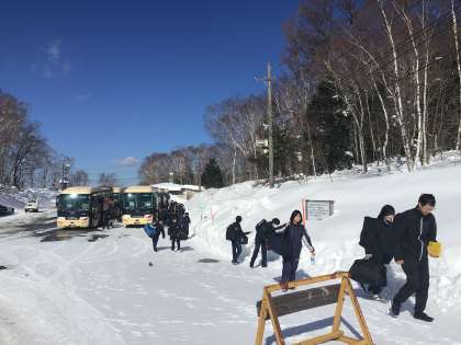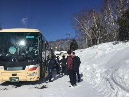 予定より少し遅れて国立乗鞍青少年交流の家に到着しました。絶好の冬晴れ!