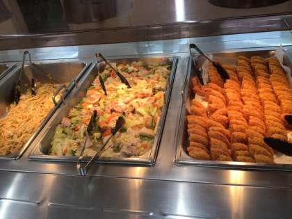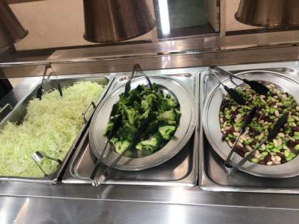 夕飯の時間です。メニューは焼きうどん、鶏肉とキャベツの中華風炒め、ブロッコリーのサラダ、ヨーグルト、フライドポテト、ハムカツ、豆、などなどです。いつもいろんな種類のおかずを準備してくださっています。美味しくいただきましょう。