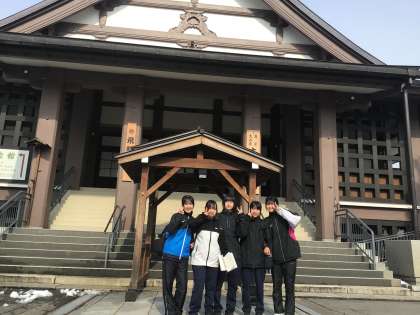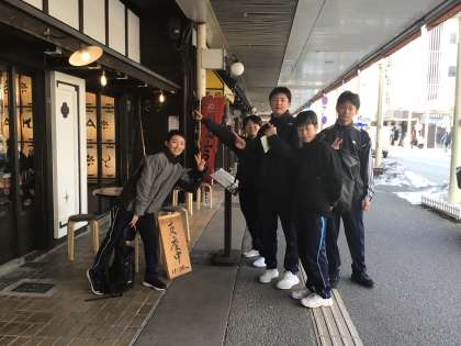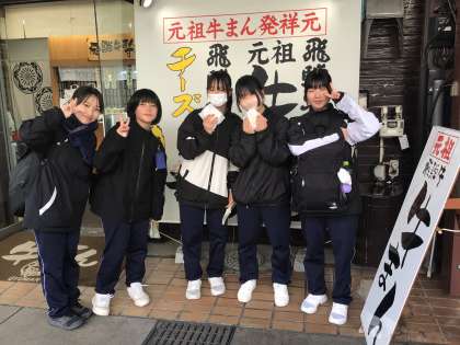 高山散策スタート!早速飛騨牛の肉まんをゲットした女子班、開店早々の高山ラーメンの店に押しかけている男子班を発見。約2時間の散策を楽しみます。