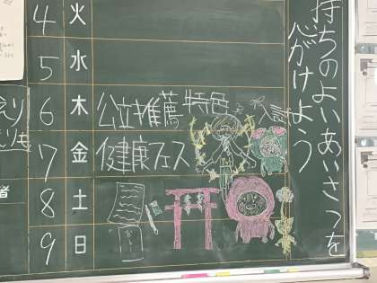 2枚目の写真は3年生教室の背面黒板です。明日は公立高校の推薦入試と特色入試です。神社の鳥居マークのイラストが描かれています。「良い結果を祈る」という生徒たちの気持ちだと思います。みんなで支え合いながら1日1日を大切に過ごしてくださいね。