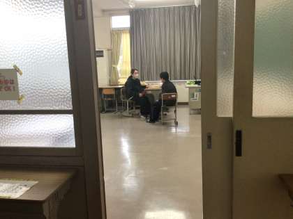 そこで、テスト期間中は、6時間目の後にテスト勉強をする時間を設け、生徒が静かにテスト勉強に取り組んでいる間に先生たちは1人ずつ生徒を呼んで話をします。上の学年になると進路の話もします。正面で向き合うと生徒も緊張しますので、45度に座って話をするようにしています。緊張せずにどんなことでもいいので担任の先生に話してくださいね。