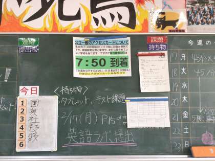 今日は公立高校一般入試の出願締切の日です。どの子も悩みながら時間をかけて進路決定をしてきたと思います。卒業に向けて仲間との時間を大切にしつつ、これから入試を迎える生徒たちは特に、残りの時間をしっかりと受験の準備にあててほしいです。それぞれの春を良い形で迎えられるよう、今の時間を大切に過ごしてください。