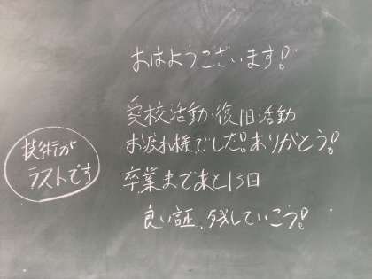 ついこの間、卒業までの登校日はあと30日‥と思っていましたが、残りの日数がどんどん少なくなってきました。証学年の卒業が迫ってきました。寂しいです。