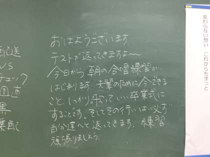3年生はあと13回登校したら卒業です(卒業式当日を入れると14回)在校生も今日から卒業式の歌の練習を学級で行います。