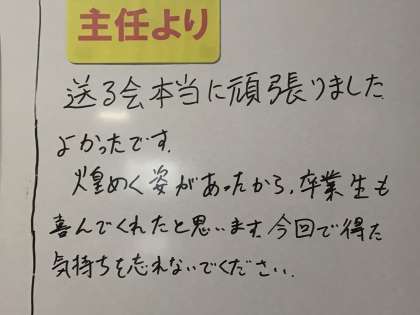 2年生の皆さん、昨日の3年生を送る会は本当に立派でした。12月ごろから自然教室の準備と並行して昨日の会の準備も行ってきましたね。とても忙しく、大変だったと思います。学年のホワイトボードに主任のメッセージや昨日の会の写真が掲示してありました。皆さんの頑張りが嬉しくて、先生たちが昨晩準備してくれたのでしょう。時間がある時にぜひ見てくださいね。