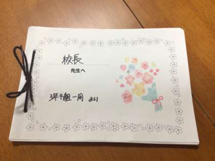 昨日、3年生の生徒たちが校長室にメッセージを届けてくれました。とても嬉しいです。温かいメッセージをどうもありがとう。一つ一つ読ませてもらいました。卒業した後もきっと読み返してしまうと思います。メッセージとともに届けてくれた笑顔。素敵な贈り物をもらいました。ありがとう。明日は素晴らしい卒業式にしましょう。