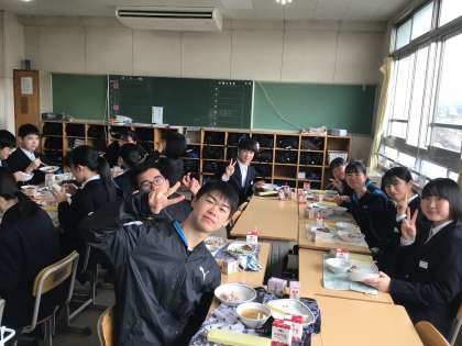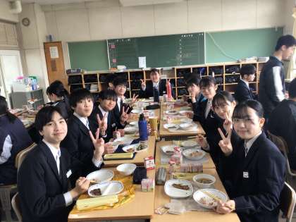 最後の給食は赤飯、ケーキ付きです。卒業おめでとう。