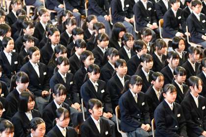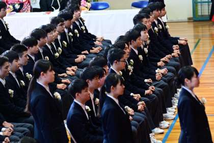 担任の先生に名前を呼ばれるのも今日が最後です。後輩たちは後ろでしっかりと式を支えてくれています。一人一人が和紙の証書をしっかりと受け取りました。証書の名前を毛筆で書いてくださったのは養護教諭の山下先生です。豊田市の和紙で作られた卒業証書。一人一人の証書は、世界でただ一つの卒業の「証」です。